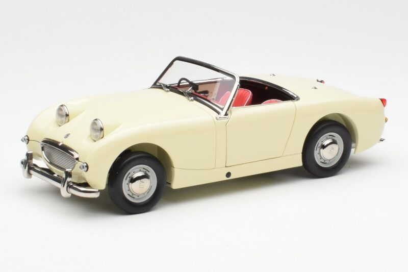 The Austin-Healey Sprite Mk I Open Old English Branco Kyosho 1:18 is crafted from Metal. Die-cast zinc alloy body with detailed plastic parts, rubber tires, and high-quality paint finish. Die-cast models are known for their weight, durability, and realistic feel.