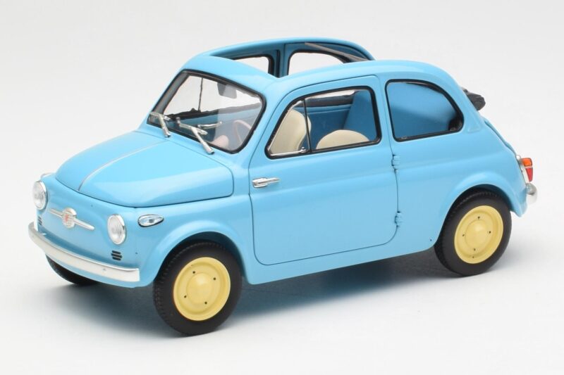 The Fiat Nuova 500 Celeste Azul Kyosho 1:18 is crafted from Metal. Die-cast zinc alloy body with detailed plastic parts, rubber tires, and high-quality paint finish. Die-cast models are known for their weight, durability, and realistic feel.