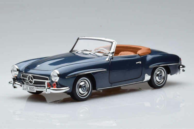 The Mercedes 190 SL W121 Roadster Azul Norev 1:18 is crafted from Metal. Die-cast zinc alloy body with detailed plastic parts, rubber tires, and high-quality paint finish. Die-cast models are known for their weight, durability, and realistic feel.