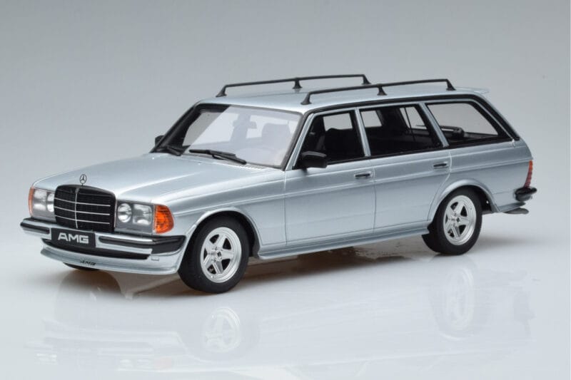 A 1:18 scale model measures approximately 25-28 cm (approximately 10-11 inches). The Mercedes 280 TE AMG S123 Prata Otto 1:18 is perfect for display in a glass cabinet or on a shelf.