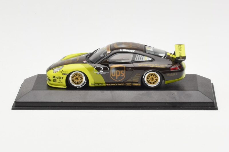 The Porsche 911 996 GT3 Cup #2 UPS Mamerow Minichamps 1:43 is crafted from Metal. Die-cast zinc alloy body with detailed plastic parts, rubber tires, and high-quality paint finish. Die-cast models are known for their weight, durability, and realistic feel.