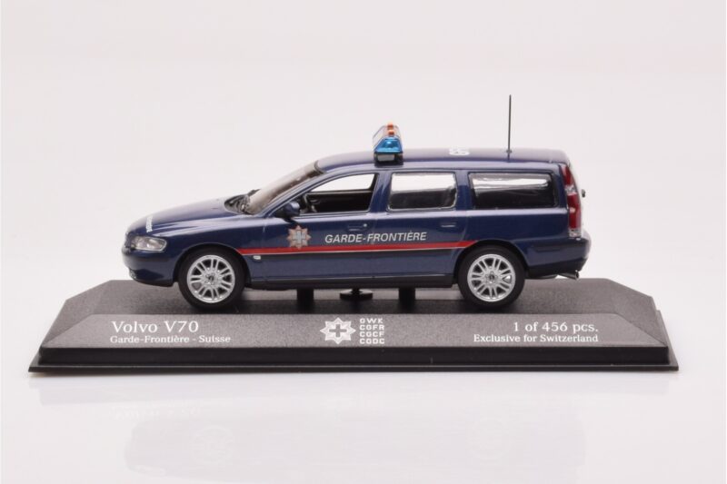 A 1:43 scale model measures approximately 10-12 cm (approximately 4-5 inches). The Volvo V70 Garde Frontiere Suisse Minichamps 1:43 is perfect for display in a glass cabinet or on a shelf.